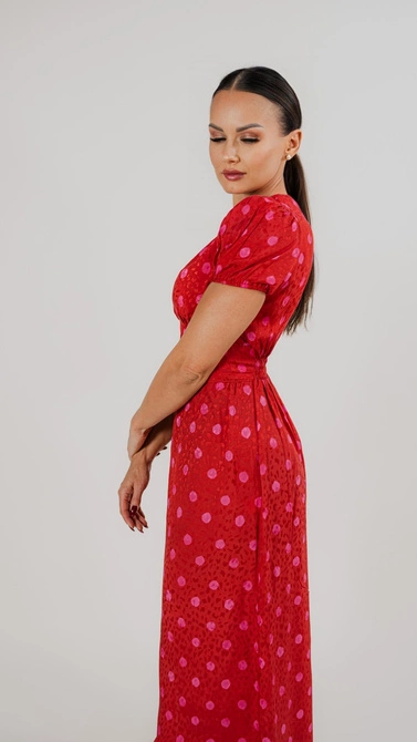 - Przyjemny dla skóry wiskozowy materiał, modny krój, bufiaste rękawki, gumki na plecach, długość maxi, pas profilujący biust, oblekane guziki, print w kropki oraz żakard.