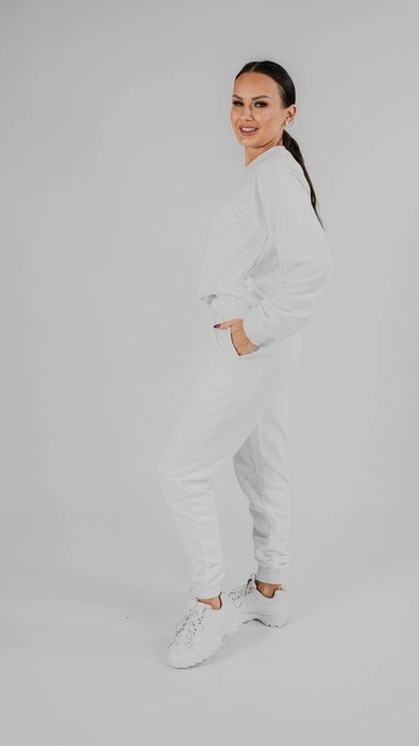 - Przyjemny dla skóry bawełniany materiał z 10% domieszką poliestru. Krój regular fit. Raglanowy rękaw. Wykończenie ściągaczem w tym samym kolorze. Spodnie z bocznymi kieszeniami. Kolor zgaszona biel. Firmowe metki na bokach.