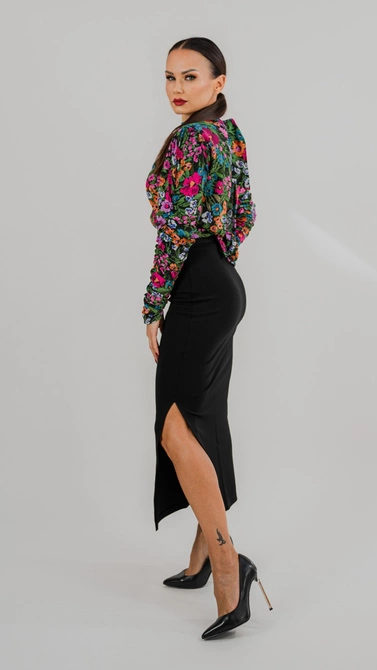 - Dopasowana spódnica z dzianiny typu punto z pęknięciem.