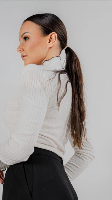 Bluzka z ażurowej dzianiny w kolorze ecru i czarnym wykończeniem