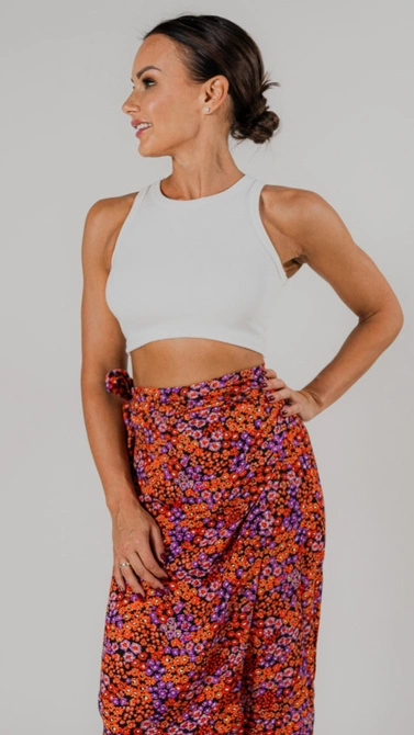 Spódnica Venice to przede wszystkim - piękny kwiatowy print oraz świetnej jakości wiskozowy materiał. Wiązanie w pasie ułatwia regulowanie rozmiaru, tak więc śmiało mogą po nią sięgać drobne XS-ki a także L-ki. Dzięki połączeniu koloru pomarańczowego, fioletowego, białego i czarnego, spódnica Venice daje Ci szeroki wachlarz możliwości jeśli chodzi o komponowanie stylizacji. Zaszalej tego lata !